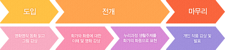 | 자신의 마음을 해바라기로 나타낸 고흐처럼 나의 마음을 닮은 해바라기를 그리고 곡물을 붙여 씨방을 표현하는 활동 | 방안의 사물을 꾸미고 세워 나의 방을 표현하는 입체 활동 | 가족과 함께 했던 일 중 행복하고기뻤던 순간을 떠올리며 나무를 그려 보는 활동 | 밤에 본 우리집과 주변 풍경을 그리고 밤하늘의 모습을 필름 위에 풀을 섞은 물감으로 핑거페인팅하는 활동 | 가족과 함께 밤 풍경을 감상한 후, 노란색 물감과 반짝이 풀로 별과 달빛을 표현하는 활동 |
